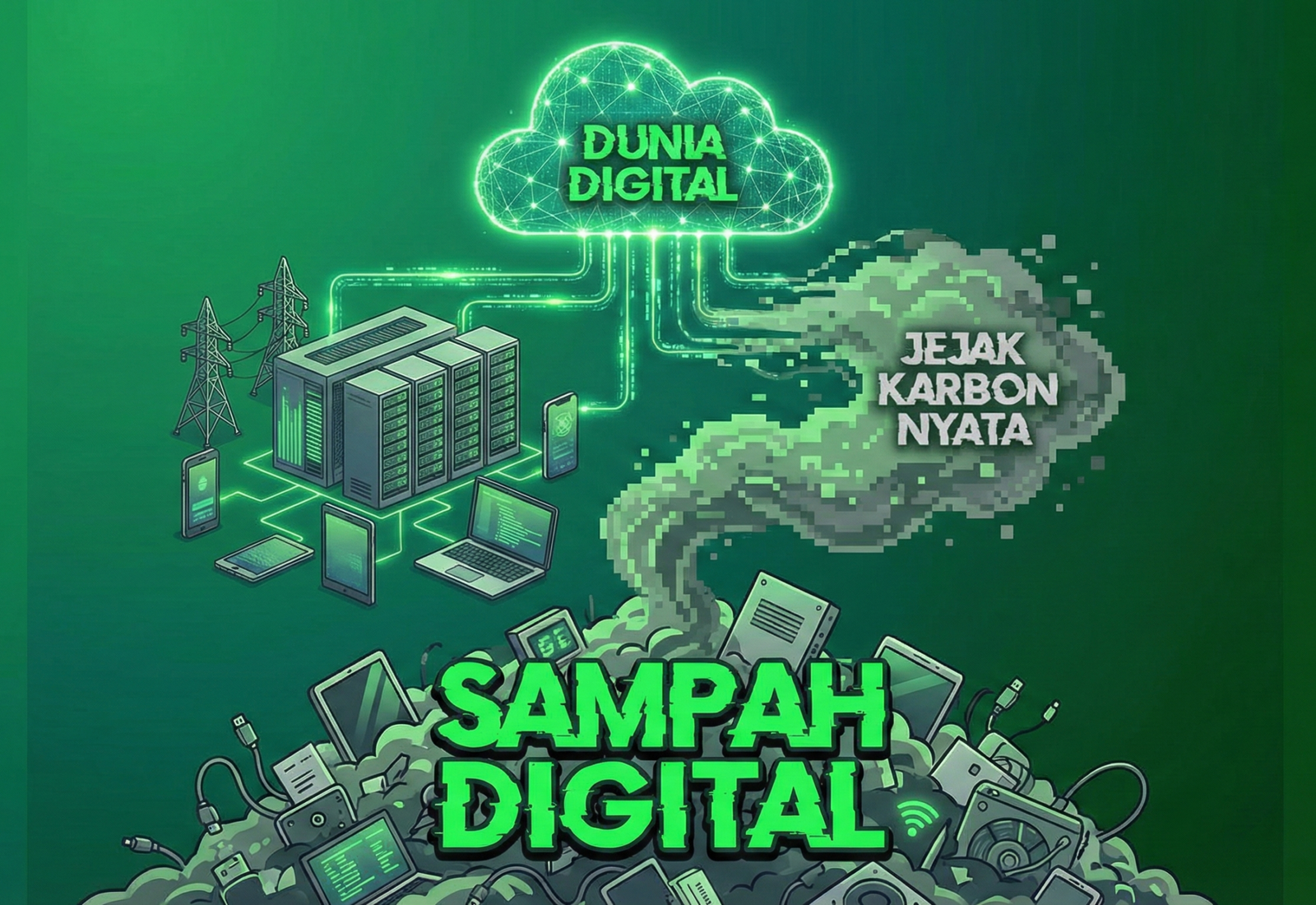 Kita sering berpikir dunia digital itu bersih dan tak berwujud. Namun, pusat data (data center), jaringan transmisi, dan perangkat kita menghasilkan jejak karbon yang nyata. Ini adalah kisah tentang Sampah Digital.